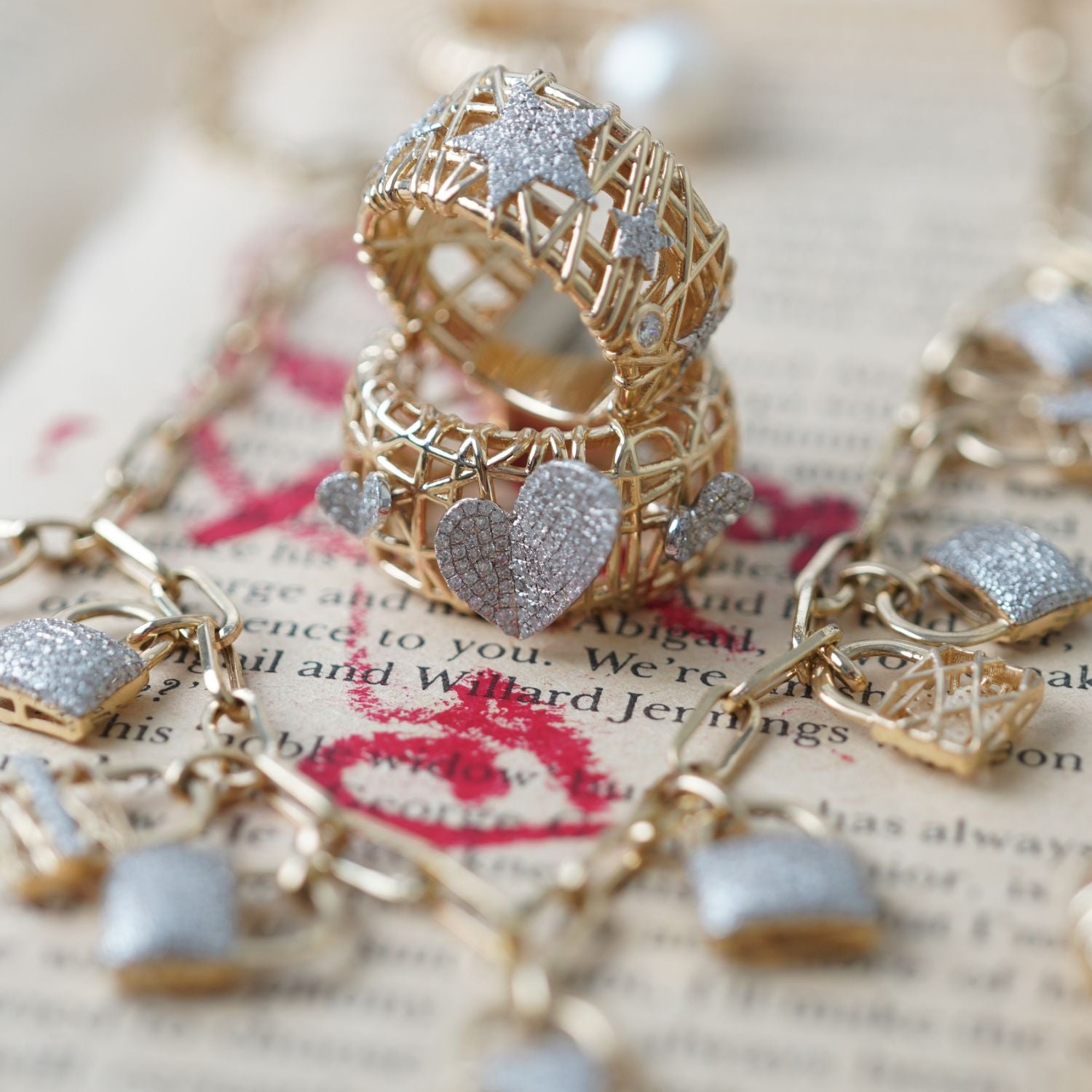 The "Gridlock" Collection exclusively designed by Rudy Santayana captures the harmony between modern architecture and the cosmos. Crafted in solid 14kt. yellow gold and fine natural diamonds, each piece features an intricate lattice openwork design reminiscent of golden grids. Within these structured beauties, pave set diamond motifs — stars, hearts, moons, clovers and locks.