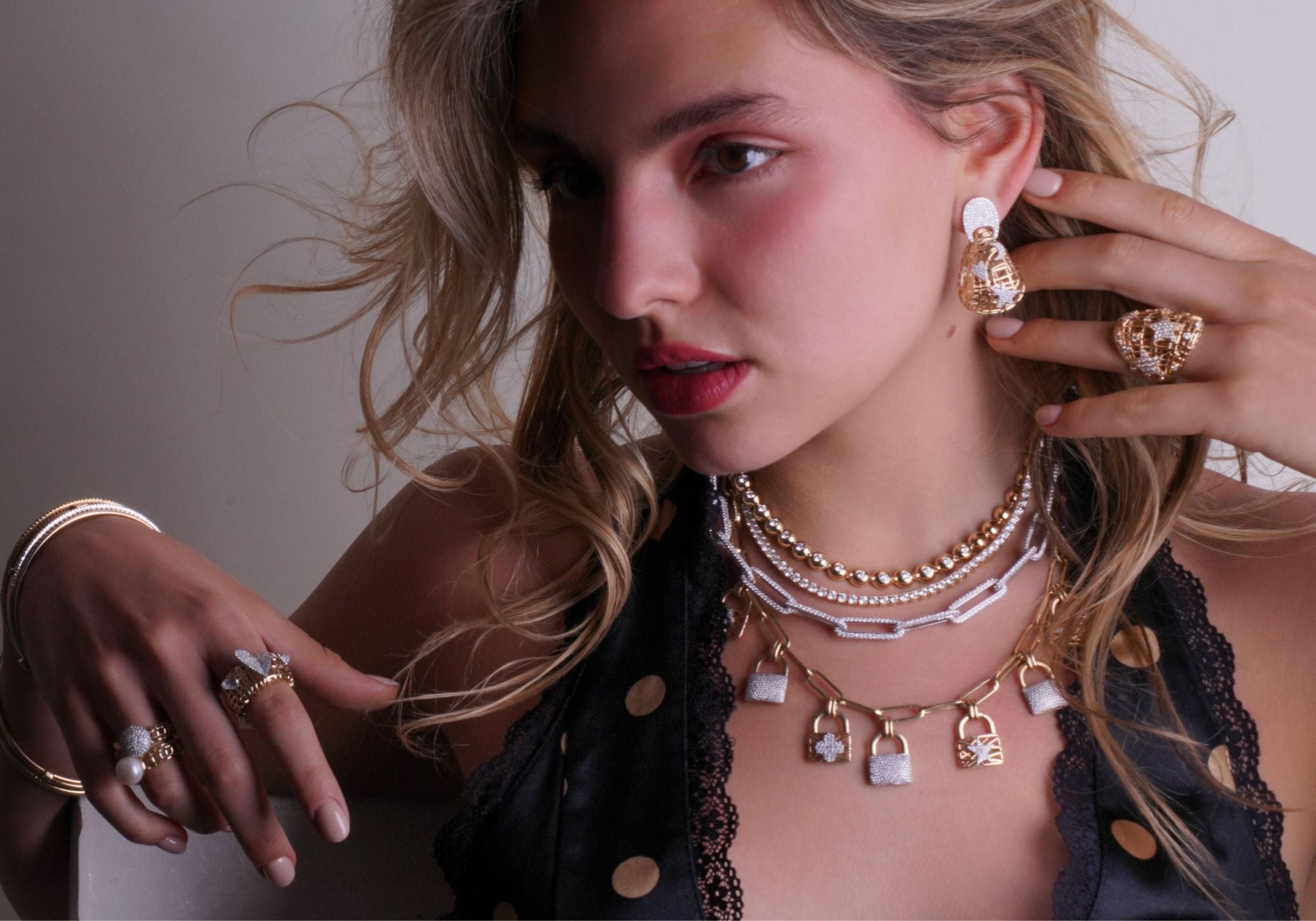 The "Gridlock" Collection exclusively designed by Rudy Santayana captures the harmony between modern architecture and the cosmos. Crafted in solid 14kt. yellow gold and fine natural diamonds, each piece features an intricate lattice openwork design reminiscent of golden grids. Within these structured beauties, pave set diamond motifs — stars, hearts, moons, clovers and locks.