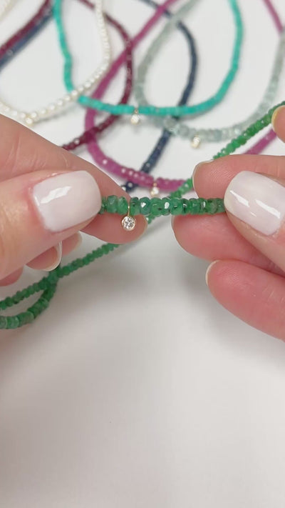 Our "Marrakech" beaded gemstone necklace is the perfect layering piece to wear with your daily stack - It adds just the right pop of color. This bestseller features faceted rondel gemstones, and a14kt. yellow gold, bezel set, brilliant cut, diamond charm. Choose from a beautiful selection of gemstone beads like majestic ruby, regal emerald, flirty pink sapphire + many more. You'll want to layer them all! Click here to view our freshwater pearl option.